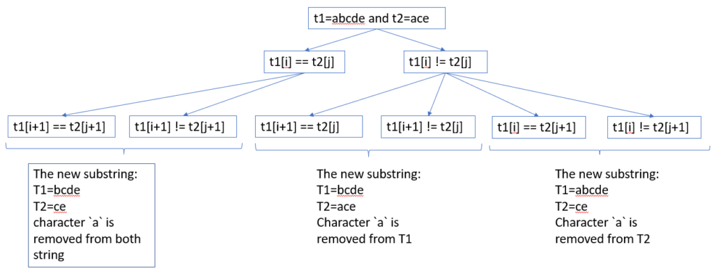 iis index of first character in substringText1;jis index of first character in substring oftext2. - recurrence relation: For top-down solution, we define recursive call