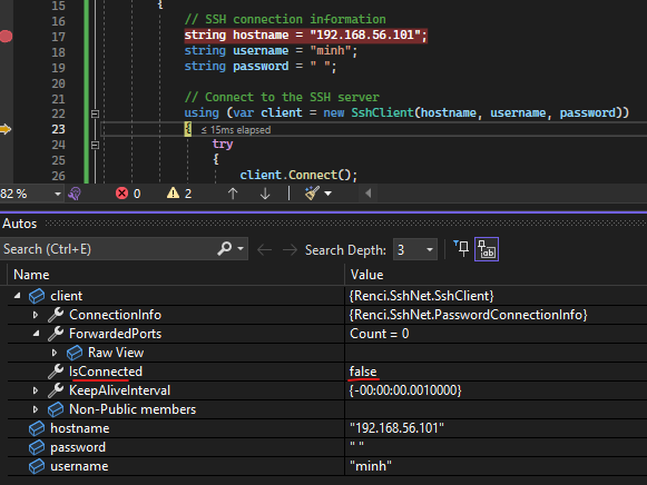 While debugging we could see more information contained in SshClient. For example, the above shows that Isconnected = false, indicating that no connection is established yet.