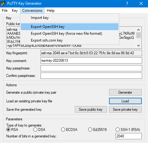 Method 2: Use PuttyGen in Windows host to create private and public key. This will enable password less connection from Putty to the Linux remote machine. This will also export SSH private and public key to be used.