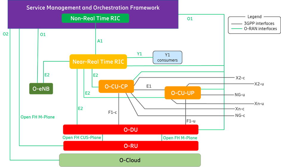 - O-RAN network functions, which includes Real-Time RAN Intelligent Controller (Near-RT RIC), O-RAN Central Unit (O-CU), O-RAN Distributed Unit (O-DU).
