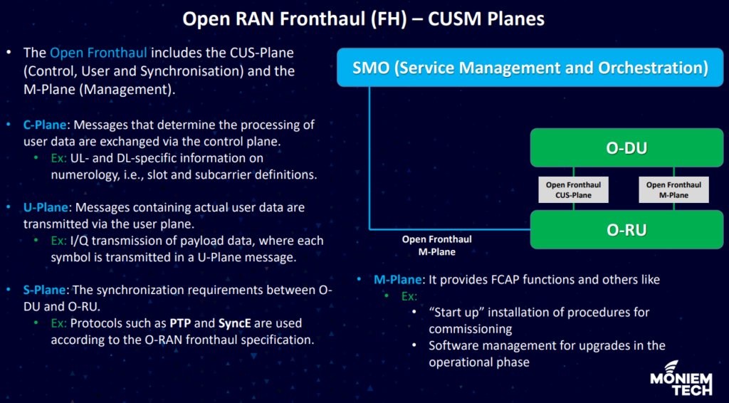 O-RAN architecture adds a few more function nodes and interfaces; among them are SMO, O-DU and O-RU. Those logical functions and the interfaces between them made up Open FH CUS plane and Open FH M plane.