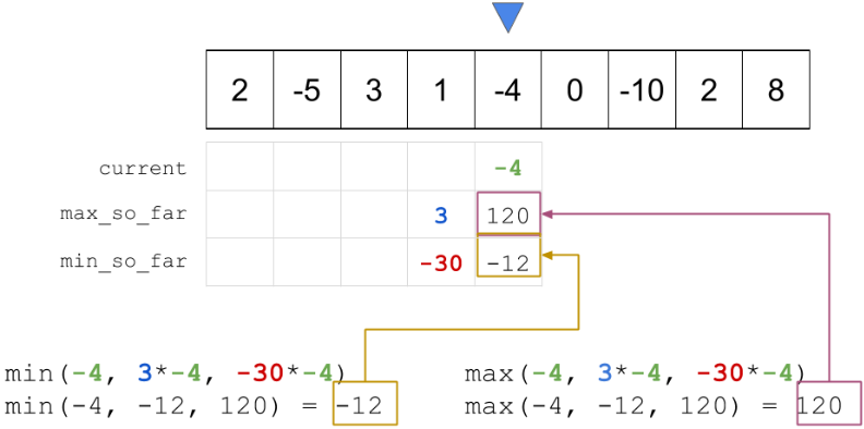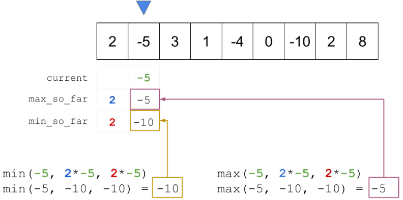 min_so_far = min (current, min (min_so_far*current, max_so_far*current));