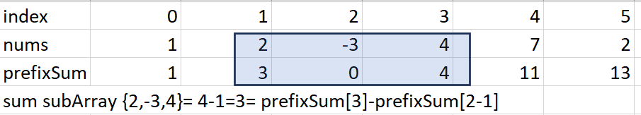 , the subarray sum is calculated byprefixSum[j] - prefixSum[i-1]