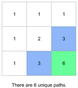 - create a 2D matrix to store value, which count that number of way to reach a certain (x,y) point. For example matrix[1][1] = 2 => from (0,0) -> (1,1) there are 2 ways.